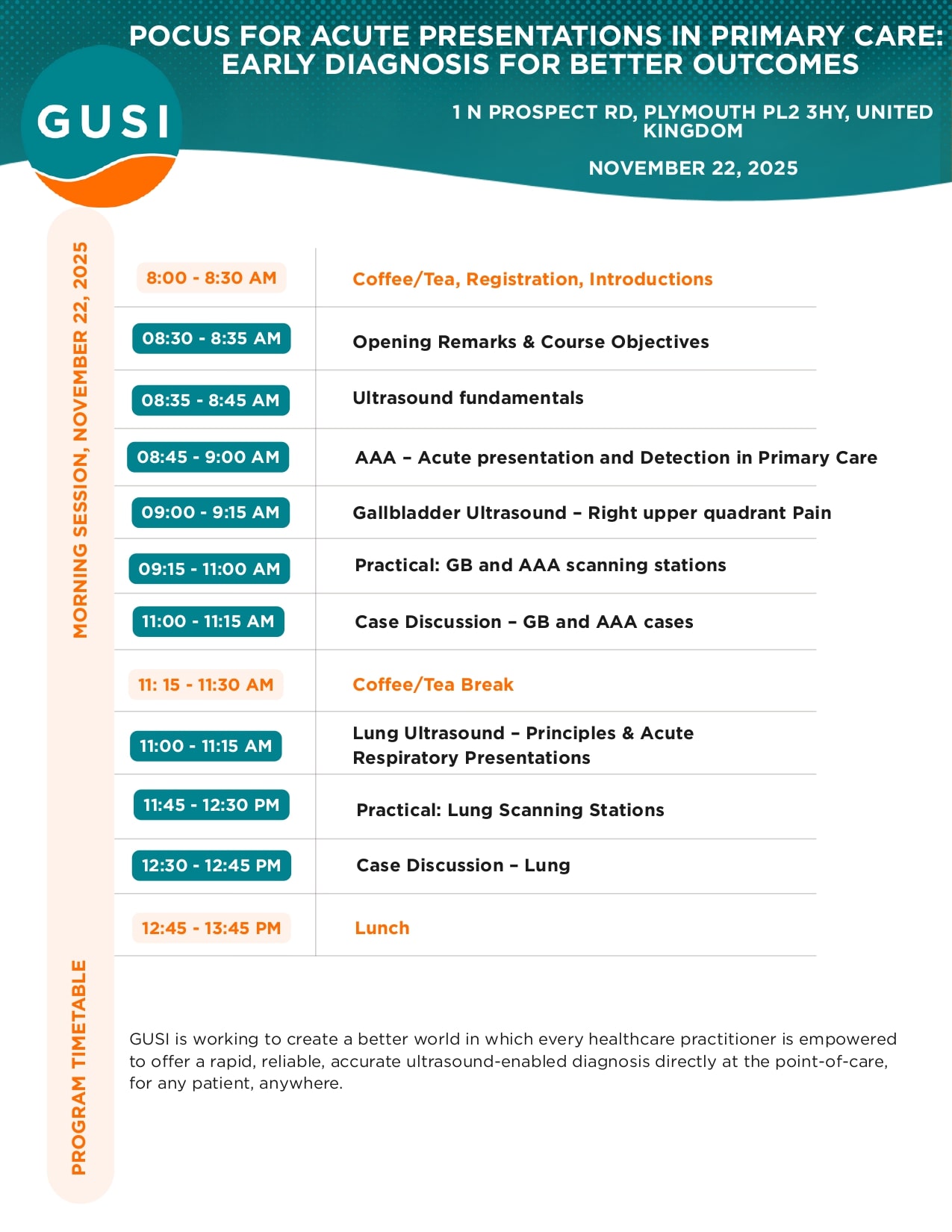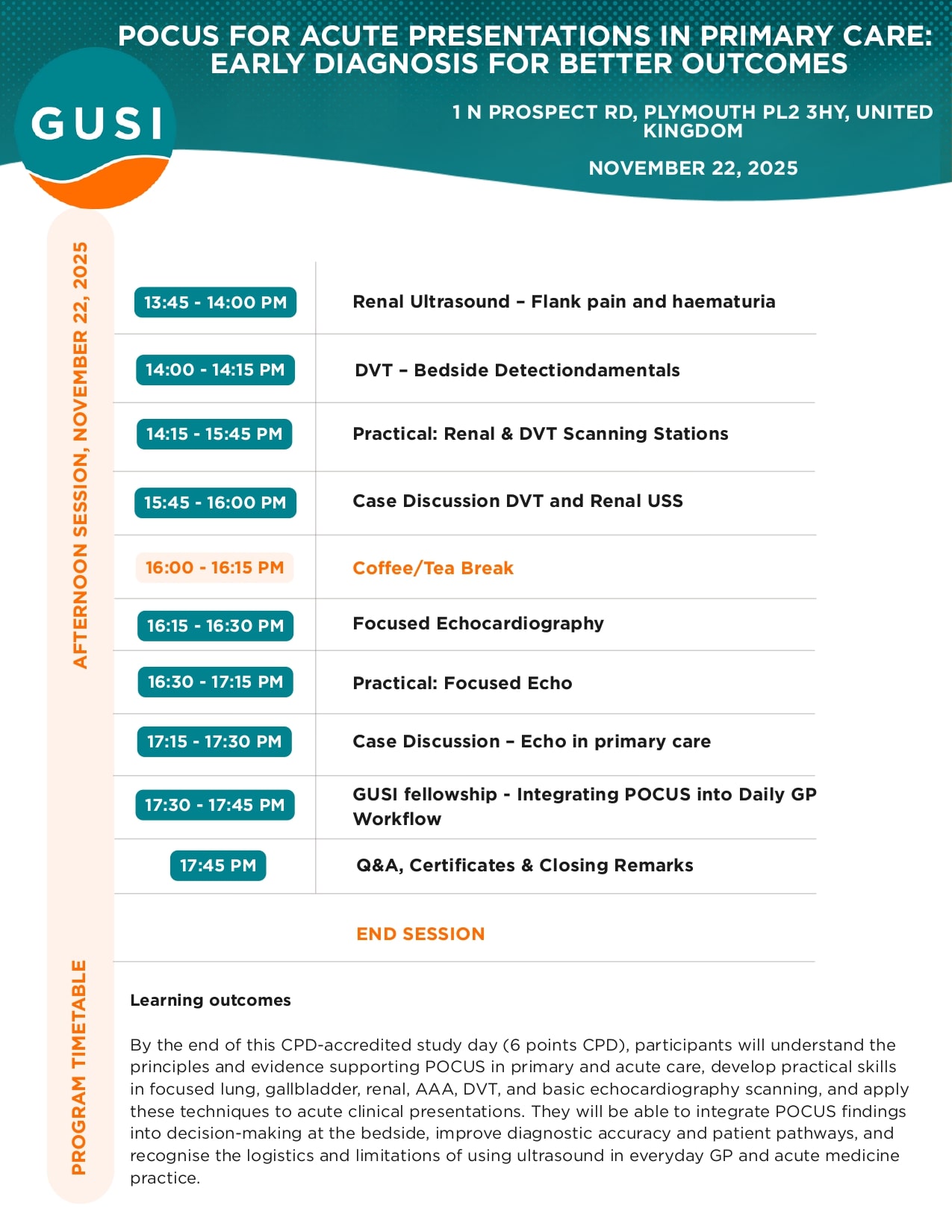 By the end of this CPD-accredited study day (6 points CPD), participants will understand the principles and evidence supporting POCUS in primary and acute care, develop practical skills in focused lung, gallbladder, renal, AAA, DVT, and basic echocardiography scanning, and apply these techniques to acute clinical presentations. They will be able to integrate POCUS findings into decision-making at the bedside, improve diagnostic accuracy and patient pathways, and recognise the logistics and limitations of using ultrasound in everyday GP and acute medicine practice.